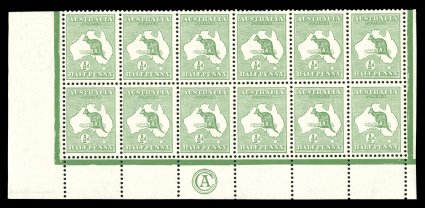 91 ogbl 1a/z image#1a/z, ½p Green, watermark inverted, a remarkable horizontal margin CA monogram block of twelve, being the bottom two rows of the left-hand pane with margins on three sides, attractively centered, o.g., nine stamps n.h., some minor creasing, overall very fine; an exceedingly rare multiple, believed to be the largest of three recorded CA monogram blocks with an inverted watermark; terribly undercataloged as this block realized A$6,325 (including premium) in the July 2005 sale of the Sir Gawaine Baillie collection; ex-Baillie (A$1,500+). (Image) Est. 3,000-4,000