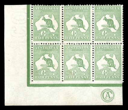 96 ogbl 1b/z image#1b/z, ½p Green, imperforate at base, a highly important bottom left corner margin CA monogram block of six, the bottom three stamps being the error, as they are completely imperforate between the stamps and sheet selvage, o.g., couple of minor h.r.'s (in top stamps and in bottom sheet selvage, the three error stamps are n.h.), lightly folded along center row of horizontal perforations, fine-very fine; of the four CA monogram pieces of this error, only two remain in private hands, the block of six offered here from the Gray collection and a block of twelve which realized A$74,500 (including premium) in the July 2005 sale of the Sir Gawaine Baillie collection (A$20,000; clearly undercataloged as evidenced by the Baillie realization). (Image) Est. 20,000-30,000