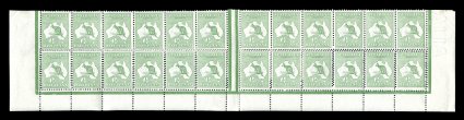 101 ogbl 1bb/zd/ze image#1bb/zd/ze, ½p Green, double perforations, a spectacular inter-panneau block of 24 (12 x 2), being the complete bottom two rows from Plate 1 (upper), includes both no monogram strips from the left and right panes, with all stamps in the bottom row displaying double perforations on three sides (normally perforated at bottom), o.g., some sensible hinge reinforcement of perforations, some of which were separated as to be expected due to the double perforating, minor selvage bends, very fine; a most remarkable showpiece; ex-Col. Evans (catalogs A$2,400 just as singles alone, unpriced as two full no monogram units). (Image) Est. 2,000-3,000