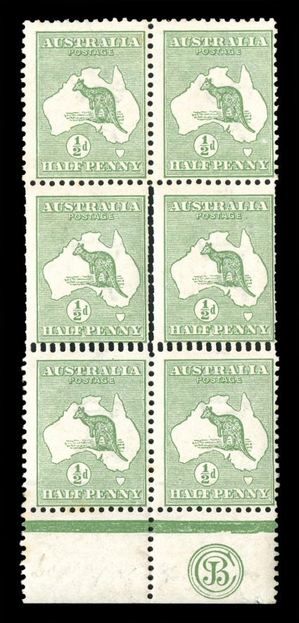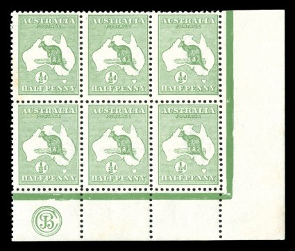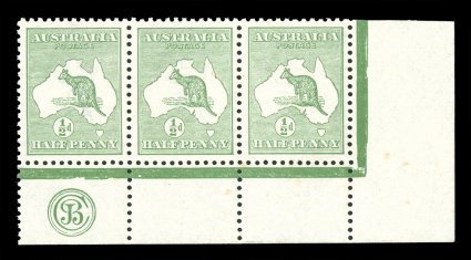 102 ogbl 1bc/z image#1bc/z, ½p Green, triple perforations, bottom left corner margin CA monogram block of nine, with the middle row displaying triple perforations on three sides, wonderfully fresh, o.g., several stamps n.h. including the varieties, a fine and visually stunning multiple; only two CA monogram pieces are known with triple perforations, the other only being a pair; the ½p is the only Kangaroo value recorded with triple perforations (A$2,000). (Image) Est. 1,500-2,000