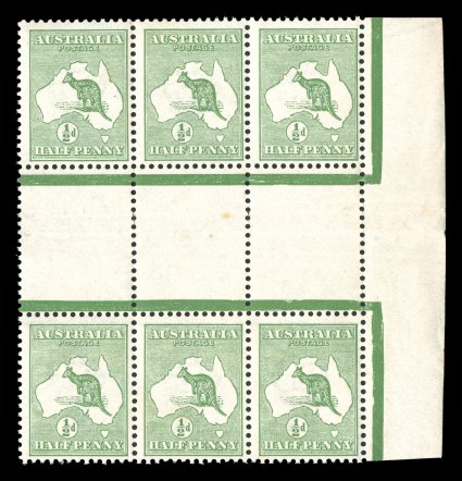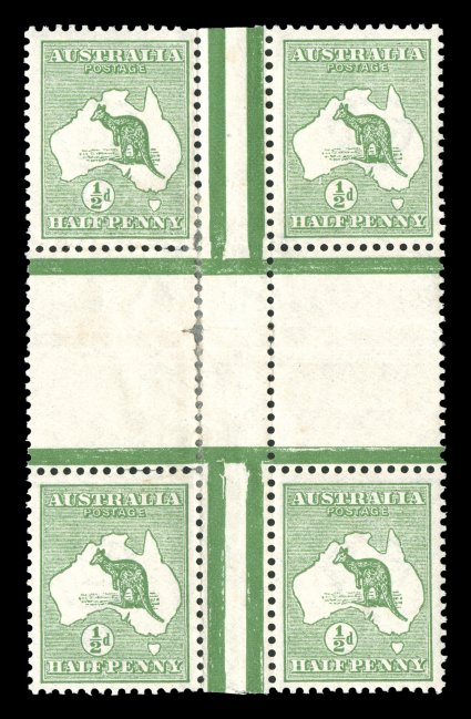 104 ogbl 1c image#1c, ½p Green, intersheet block, block of four comprised of two pairs with wide horizontal gutter between, unusually well centered, o.g., faint trace of hinging, horizontal creasing in center of gutter as found on all known examples, very fine and choice; initial supplies of the first four denominations printed - ½p, 1p, 2p and 6p - were distributed to post offices in uncut double sheets of 240, resulting in vertical intersheet gutter pairs, only a very few examples of the ½p and 1p intersheet pieces remain in private hands, all other blocks are in institutional collections (A$4,000+). (Image) Est. 2,000-3,000