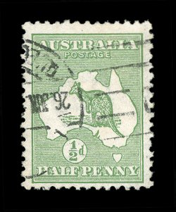 110 O 1o image#1o, ½p Green, "AUSTBALIA" variety, a rare used example showing a defective "R" in "AUSTRALIA" inscription at top, neatly cancelled, very fine; the most elusive and most popular of all the plate varieties found on this value, in fact, only two mint examples and a small handful of used examples are known (A$1,000). (Image) Est. 750-1,000
