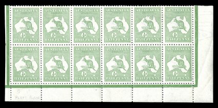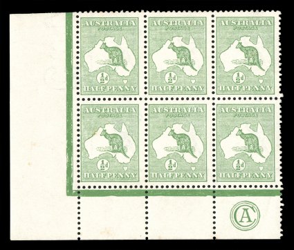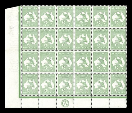 112 ogbl 1z image#1z, ½p Green, bottom left corner margin CA monogram block of 24 (6x4) from Plate 2, with position 2L55 showing the break in shading over the "U" of "AUSTRALIA", marvelously well centered for a multiple of this size, fresh and bright, o.g., couple of minor h.r.'s, most stamps n.h., horizontal bend in second horizontal row (not part of monogram block), plus lightly folded along second row of horizontal perforations, overall very fine (A$600+). (Image) Est. 300-400