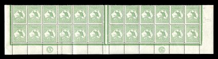 109 ogObl 1A-C vars. #1A-C vars., ½p Green, plate varieties, a wonderful specialized group of 18 items in singles, pairs and various sized blocks (111 stamps in all), well annotated on exhibition pages noting the many constant plate flaws found on this value, includes a block of 42 showing numerous varieties including the large colored flaw off the coast at Sydney [1R40], several examples of the "ROSTAGE" flaw [2L12] in various states (including two examples in scarce coil strips of four), defective "ST" of "AUSTRALIA" [2L13] in three stages (including a mint block of 18 punctured "T" for use by the Tasmanian Government Departments), we also note a used example of the scarce "Bite" out of the upper side of Kangaroo's tail [2R6], all but four stamps are mint, o.g., several stamps n.h., overall fine-very fine. Est. 500-750