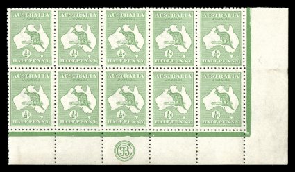 116 ogbl 1zb image#1zb, ½p Green, bottom right corner margin JBC monogram block of ten from Plate 2, exceedingly well centered and margined throughout, o.g., stamps n.h., couple of h.r.'s in bottom sheet selvage where there are a few light toning specks on the reverse only, lightly folded along horizontal perforations, still very fine (A$500+). (Image) Est. 200-300