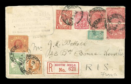 119 c 1 image#1, ½p Green, single, tied to registered stamp dealer (Howard Davis) corner card cover, along with three adhesives from New South Wales, one from Queensland, two from South Australia and four from Victoria by "South Melbourne/15.1.13" second day of issue double circle postmarks, addressed to France, some States stamps with small faults, still fine overall and colorful; for years it was originally thought the first day of issue of the ½p Kangaroo was in Melbourne on January 16, 1913 (based on a dated piece in the Royal Collection), now January 14th is now regarded as the first date of issue, the following day (represented by this cover) is the earliest that the ½p stamp could have been on sale at the South Melbourne post office. (Image) Est. 400-500