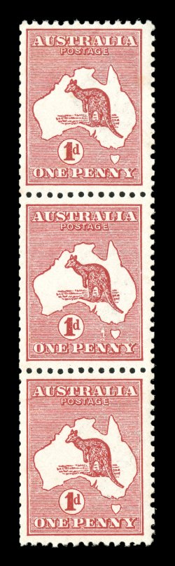 120 og 2(B), 2(C) vars. image#2(B), 2(C) vars., 1p Red, Die I, coil, two scarce coils strips, the first being a strip of three from Plate B, with one stamp showing the scarce "'1' flaw west of Tasmania" variety [l40], the other being a paste-up strip of five from Plate C, with one stamp showing the "white scratch from 'L' of 'AUSTRALIA' to near coast" variety [L37], o.g., top stamp with minor h.r. on each strip, fine-very fine. (Image) Est. 200-300