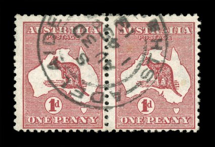 121 O 2 var. image#2 var., 1p "Cherry red", Die I, used horizontal pair, featuring a remarkably distinctive shade, the so-called "Cherry red" shade, whose name was dubbed by the 1p Kangaroo expert Dormer Legg, which shows strong bluish hues within the ink, double circle "Adelaide/AU 30 13" postmark, fine; a wonderful and scarce shade variety for the 1p specialist; ex-Legge. (Image) Est. 300-400