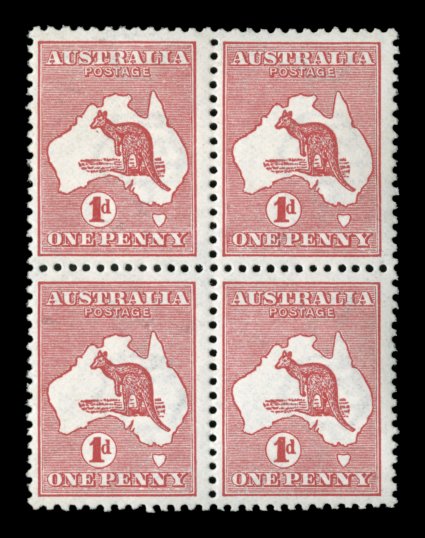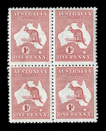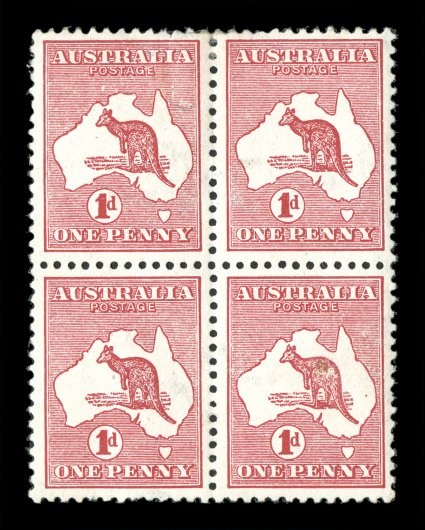 125 ogbl 2ab image#2ab, 1p Red, Die I, watermarked sideways, crown pointing to left, a seldom seen mint block of four, quite well centered, deep rich color, o.g., couple of stamps within the block have imperfections, including the top left stamp which has a thin spot and a small perforation flaw, still a very fine appearing multiple; very few blocks of this watermark variety exist (A$6,000+). (Image) Est. 2,000-3,000