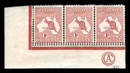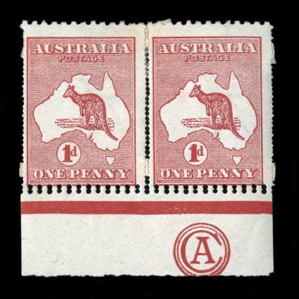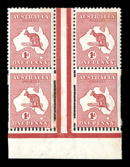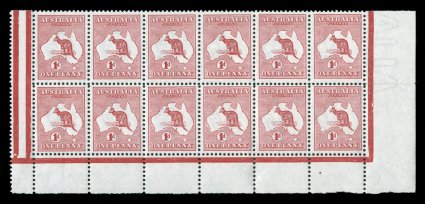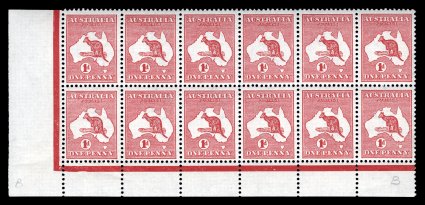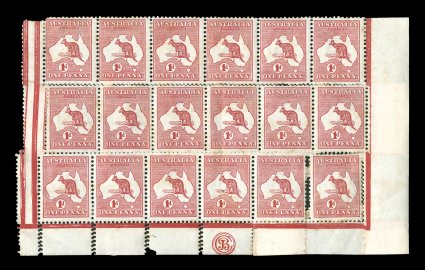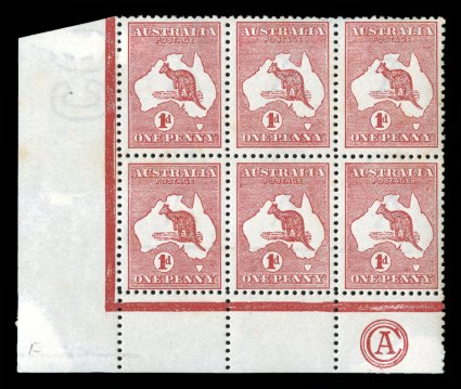 134 ogbl 3(D)z image#3(D)z, 1p Red, Die II, bottom left corner margin CA monogram block of six from the left pane, position 51 showing the "white-faced kangaroo" variety, well centered, rich color, o.g., couple of minor paper adherences and very faint gum toning spots, still very fine (A$600+). (Image) Est. 200-300