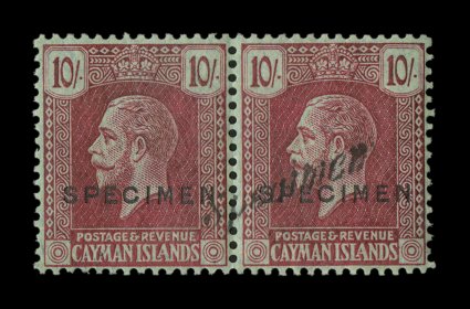 2321 S S.G. #83S var. imageS.G. #83S var. 1926 10/- Carmine on green, with "Specimen" overprints from the Rhodesia archives, horizontal pair of this late issue with multiple Crown and script "CA" watermark, each with the normal U.P.U. "Specimen" overprint, plus one diagonal script "Specimen" overprint (local type R4) over the two stamps, deep color, well centered, o.g., n.h., very fine and exceptionally choice; this overprint was applied by the Rhodesian authorities to some of the specimens that were sent to them as well as rarely to their own stamps, exceptionally scarce and seldom encountered being particularly desirable in a multiple of this key high value; ex-Green (Scott #63S var.). (Image) Est. 300-400