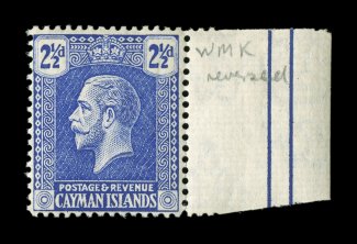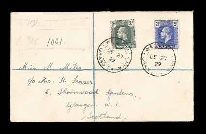 2329 c S.G. 73, 74 imageS.G. #73, 74, 1922 2p Slate grey and 2 1/2p Bright blue, tied to neat registered cover to Scotland by scarce black "West Bay/Grand Cayman/DE 27 29" double circle cancel, Type 1, via Georgetown receiving the large violet registry violet handstamp, Type R10, but no other transits until it receives a registry oval of Birmingham, England, very fine; even at this late date this first cancel of West Bay is quite scarce (Scott #54, 55). (Image) Est. 150-200