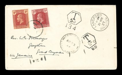 2324 c S.G. #62, 71 imageS.G. #62, 71, 1922 4p Red on yellow and 1p Deep carmine red, used on an inbound petite cover as postage dues, originally posted from England with "Langford/Bristol/21 MR 27" c.d.s. to a member of the clergy in Georgetown with Type 5 Georgetown double circle receiving c.d.s. of April 23, 1927, two different hexagonal due rate markings, stamps tied by the Georgetown "T" in circle due handstamp, all the markings are attractively placed on the front, very fine; a scarce and quite early postage due cover paying the double rate 1 1/2p +1p Empire letter rate plus 2 1/2p postage due (Scott #52, 65). (Image) Est. 200-300