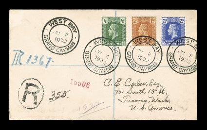 2325 c S.G. #69, 72, 74 imageS.G. #69, 72, 74, 1921-22 1/2p Pale grey green, 1 1/2p Orange brown and 2 1/2P Bright blue, all tied to lovely registered cover to Tacoma, Washington by excellent strikes of "West Bay/Grand Cayman/JU 8 1932" double circle c.d.s., Type 2, similar Georgetown transit on the reverse and routed through Cuba via Key West with Jack. & Key West railroad transit, backstamped, extremely fine; a remarkably attractive cover from this tiny post office paying the 2 1/2p foreign letter rate and 2p registry fee (Scott #51, 53, 55). (Image) Est. 200-300