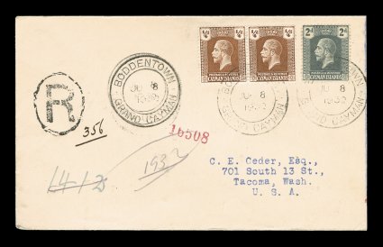 2326 c S.G. #69, 73 imageS.G. #69, 73, 1922 1/4p Yellow brown pair and 2p Slate grey, tied to interesting registered cover to the United States by two strikes of "Boddentown/Grand Cayman/JU 8 1932" double circle c.d.s., Type 3, with additional strike at left, Georgetown transit, via Cuba and Key West with Jack. & Key West railroad cancel, backstamped Tacoma, Washington, slightly reduced at right, exceptionally clean and attractive, very fine; this is a highly unusual cover as the U.P.U. letter rate was 2 1/2p, but the registry fee was 2p more which was not paid, yet this cover was treated as registered through Georgetown, Cuba and all of the United States without any postage due notations, very unusual and a desirable cover from this small post office (Scott #54, 55). (Image) Est. 150-200