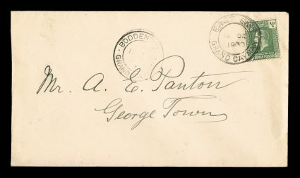 2327 c S.G. #70 imageS.G. #70, 1922 1/2p Pale yellow green, well centered single tied to legitimate neat domestic cover by double circle "East End/Grand Cayman/14 OC 1930" c.d.s., Type 3, similar Type 3 Boddentown transit c.d.s. at left and backstamped with Georgetown double circle c.d.s. of the same type, Type 7a, very fine; the double circle cancel of all three of these towns was put into service in September or October of 1930, each of the East End and Boddentown cancels are used within one to two weeks of the earliest known cancels of those towns; a nice commercial usage from this small outlying post office. (Image) Est. 150-200