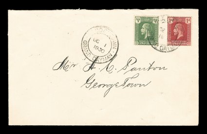 2328 c S.G. #70, 71 imageS.G. #70, 71, 1922 1/2p Pale grey green and 1p Deep carmine red, tied to cover to Georgetown by somewhat indistinct, but discernable "North Side/Grand Cayman/SE 30 1930" double circle c.d.s., Type 1, similar Boddentown cancel, Type 3, at left on the next day, and backstamped Georgetown, clean and very fine; quite likely a philatelicly inspired cover being overpaid by 1p, however the North Side marking is very scarce, especially as early as this since September 30, 1930 is the earliest documented date for a cover from this tiny post office, plus October 1, 1930 is the earliest known example of the Boddentown Type 3 postmark, in all a very rare cover (Scott #51, 52). (Image) Est. 400-500