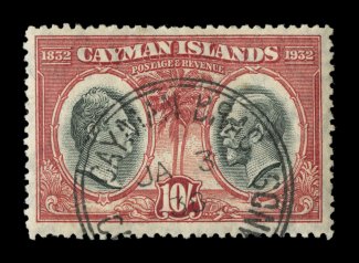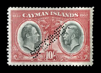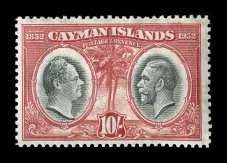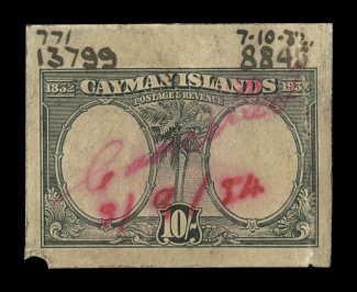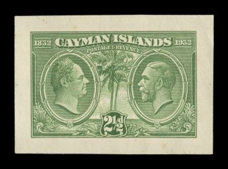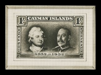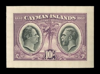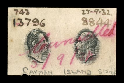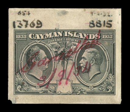 2332 E image1932 Centenary composite essay of the King William IV portrait that was adopted for the issue and a proposed Palm and Ship design representing the Cayman Islands, with Waterlow monogram in the center, a line engraved essay on stiff cream bond, in carmine measuring 50x119mm showing the full die sinkage, very fine; a handsome and rare proof; ex-Green. (Image) Est. 750-1,000