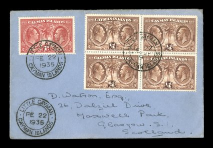 2339 c S.G. #84, 86 imageS.G. #84, 86, 1932 1/4p and 1p Centenary, block of four of the former and single of the latter, tied to blue cover to Scotland by early "Little Cayman/Cayman Islands/FE 22 1935" double circle c.d.s., Type 1, each with nice strike of this seldom seen cancel plus perfect strike at bottom left, very fine; the post office on this more remote island did not open until October 1, 1934, early covers such as this are actually quite scarce (Scott #69, 71). (Image) Est. 150-200