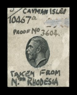 2340 P image1935 King George Pictorial Waterlow file die proof for the King's portrait, an unusual proof that shows how various dies were used in the inner workings of the security printers, this portrait proof is very similar to the master die that was eventually produced for the Cayman Islands, at top is inscribed in manuscript "Cayman Isles" and at bottom "Taken from Nthn Rhodesia", also has revised die no. 10467a and proof no. 3604, the original die 10467 evidently had a larger portion of the Rhodesia design as there is evidence that this image was extracted and the rest of the design removed, very fine for this unique production file proof; ex-Green. (Image) Est. 500-750