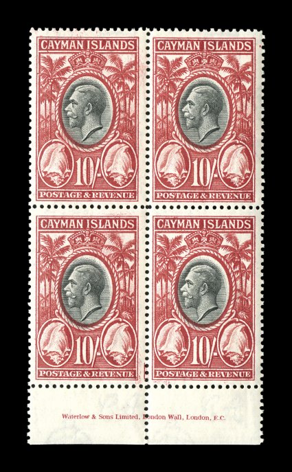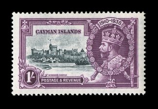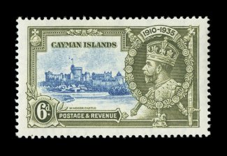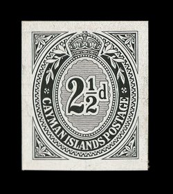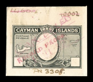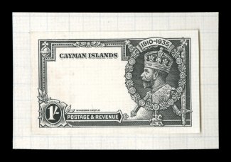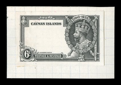 2347 P S.G. #108P-11P imageS.G. #108P-11P, 1935 1/2p to 1/- Silver Jubilee, die proofs for the frame plates cplt., a handsome, and quite likely unique, set of the four values showing the frames and portrait of King George V with central vignette blank, each is in black on bright white wove paper and measures 43x27mm, affixed at the left edge to small piece of page from the De La Rue archives, all are crisp and exceptionally fresh with razor-sharp proof impression, extremely fine; four different security printers were used to produce all the Silver Jubilee omnibus issue, De La Rue produced issues for fourteen countries, Cayman Islands being one of them, the proofs offered here are a prime example of the great quality work that this company was well known for; a lovely exhibition quality set indispensable for anyone preparing an exhibit of this issue for the Cayman Islands or for this popular omnibus issue; ex-Green (Scott #81P-84P). (imagea) (Image) Est. 4,000-5,000