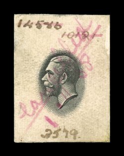 2358 E image1911 2 1/2p Postal envelope, die essay of the stamp impression in black on glazed paper measuring 34x41mm, nearly a finished proof but lacking a small triangle in front of the small "2" that is found on the issued design, fresh and very fine; a rare essay that could be easily overlooked. (Image) Est. 500-750