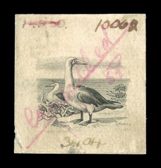 2341 P S.G. #96P-107P imageS.G. #96P-107P, 1935 1/4p to 10/- King George V Pictorials, Waterlow file die proofs, a unique assemblage of 21 different proofs in black on stiff bond, including the master head die proof for the King George V portrait used on all values, die proofs of the five basic frame designs all without value tablets and three without the King George V portrait, there two other master vignette dies of the Catboat and the Booby Bird, followed by the twelve individual values ether without central vignette or portrait, includes various reference numbers in manuscript for the die, roller and proof numbers, four with punch hole, all with "Cancelled/Record Proof/1 11 38" in red manuscript across the proof, some soiling and flaws as would be expected on these file production proofs including the three vertical designs cut into on one side, all of which is of little consequence as this unique set is the only one in existence, a visually stunning and rare group; ex-Marston, Cooley (Scott #85P-96P). (imagea) (imageb) (Image) Est. 4,000-5,000