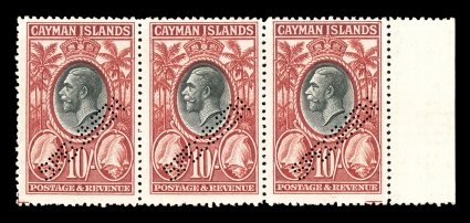 2343 S S.G. #96S-107S imageS.G. #96S-107S, 1935 1/4p to 10/- King George Pictorials perforated "Specimen" cplt., a highly unusual offering of intact sheet margin strips of three, most are in vertical strips from the bottom three rows of the sheet or bottom right corner, the two vertical format designs are side margin horizontal strips of three, bright and attractive, without gum as it was quite likely these were affixed on pages in a country's postal archives, this being about the only way that multiples are available, very fine; exceptionally rare and the only strips of three that we have seen; ex-Green (Scott #85S-96S; $900.00+). (Image) £825+