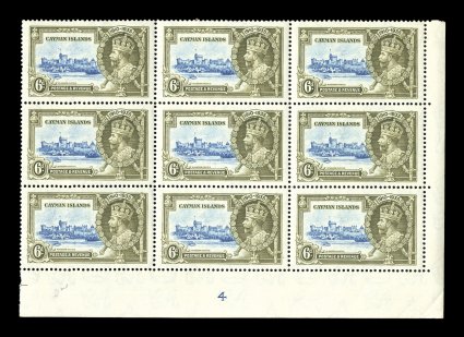 2349 nhbl S.G. #110h imageS.G. #110h, 1935 6p Silver Jubilee, dot by flagstaff, position plate 4/R 8/4, bottom right corner plate no. 4 block of nine (3x3), the variety being the top left stamp, fresh and crisp, o.g., n.h., very fine; a particularly nice example because it confirms the position and identifies the blue vignette plate no. 4 (Scott #83 var.). (Image) for hinged £202+