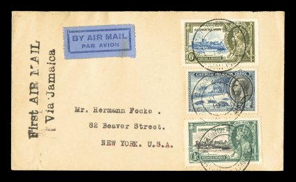 2351 c S.G. #101, 108, 110 imageS.G. #101, 108, 110, 1935 2 1/2p Pictorial and 1/2p and 6p Silver Jubilees, tied to the first air mail flight cover by "Georgetown/Cayman Islands/JY 30 1935 double circle c.d.s., Type 7a, bold special "First Air Mail/Via Jamaica" two line flight cachet, posted to New York, blue on violet blue air mail label, private company August 6, 1935 receiving handstamp on the reverse, very fine; this is the first flight involving the Cayman Islands and even then the mail for this flight was transported by the M.S. "Cimboco" by sea to Kingston, Jamaica and from there by Pan American Airways, the fee was 2 1/2p foreign letter rate plus 6 1/2p air rate; Giraldi and McCann note that the number of covers flown was very few and award winning collector of Cayman Islands, Robert J. Cooley, thought that there were perhaps as few as four covers known, in any case exceptionally rare; ex-Green (Scott #81, 83, 90). (Image) Est. 400-500