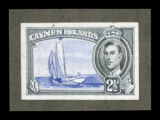 2352 E S.G. #120E imageS.G. #120E, 1938 2 1/2p King George VI artist's drawing, a stamp size bicolor wash drawing done in blue, grey and Chinese white by Hugo Fleury of Waterlow & Sons, Ltd., showing the frame and portrait of the King in grey and the vignette of the Cayman Schooner in blue, very similar to the issued value that was first issued in a single color blue and then later in orange, lacks the title for the schooner and has a pencil note in the top margin to change a misspelling of "Caymen" to "Cayman", mounted on dark grey card typical of Waterlow proofs, very fine; a unique artist's drawing and a key piece for the King George VI collector; ex-Green (Scott #105E). (Image) Est. 750-1,000
