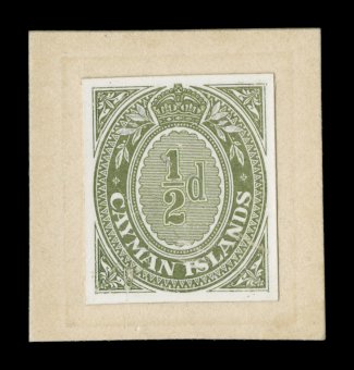 2354 E image1909 1/2p Wrapper, die essay of the stamp impression, in olive green color on thin glazed card, about stamp size and mounted on thick card measuring 31x33mm, design differs very slightly from the issued design and has some design touch up with Chinese white, dated on the reverse "5. 3. 09", very fine and rare proof from the De La Rue archives; ex-Byl, Cooley. (Image) Est. 750-1,000