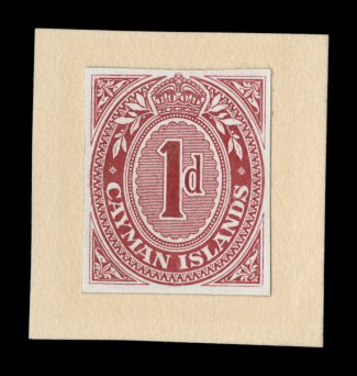 2355 E image1909 1p Postal card, die essay of the stamp impression of the design similar to what was used on both the 1p postal card and the 1p envelope, lacking some shading lines by the crown and some of the ornaments different or not completed, in rose carmine of stamp size on thin glazed card mounted on thick card measuring 31x33mm, dated "6. 8. 09" on reverse, very fine and rare proof from the De La Rue archives; ex-Freeland. (Image) Est. 750-1,000