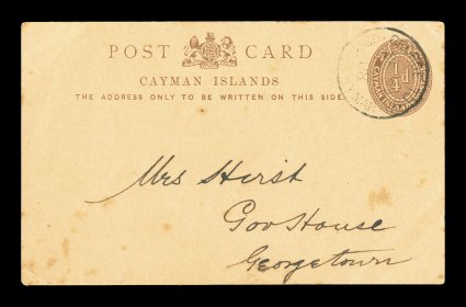 2360 c image1/4p Brown postal card, small size measuring 121x75mm, proper commercial local use with "George Town/Grand Cayman/SE 24 08" c.d.s., Type 4 pmk., announcement of a meeting of the Grand Cayman Branch of the Jamaican Agricultural Society, trivial tone spots and minor corner crease, very fine legitimate local usage that is unusually scarce. (Image) Est. 200-300