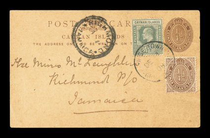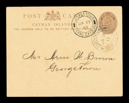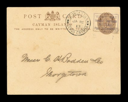 2362 c image1/4p Brown postal card, larger size measuring 115x89mm, proper intra-island posting with "Boddentown/Grand Cayman/JA 16 13" double circle c.d.s., Type 1, backstamped Georgetown, message in the same hand and ink inquires about mail or news from his family in the United States, very fine and choice; a scarce legitimate usage. (Image) Est. 200-300