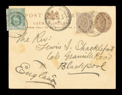 2363 c image1/4p Brown postal card, larger size measuring 115x89mm, with additional 1/4p Brown and 1/2p Green (S.G. #25, 38), tied by "Cayman Brac/Grand Cayman/JU 14 11" c.d.s., Type 2 pmk. of Stake Bay, posted to England, Kingston transit, proper 1p overseas post card rate, lengthy message concerning an order for shells, 1/2p affixed over edge, minor perf. toning and slight edge wear, very fine commercial usage (Scott #21, 31). (Image) Est. 200-300