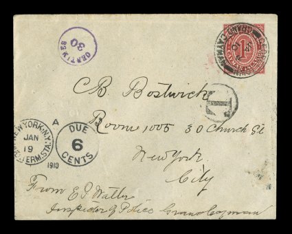 2364 c image1p Red postal envelope, posted to the United States without additional adhesives to make up the proper 2 1/2p foreign letter rate, "Georgetown/Grand Cayman/JA 8 10" c.d.s., Type 5 pmk., with "T" in circle of the Cayman Islands, duplex New York "Due 6 Cents" marking, plus "Centimes 30" international currency due marking in purple, Jamaica transit on the reverse plus horizontal pair of U.S. 3c Deep claret postage dues (Scott #J39) tied by the New York backstamped, very fine; a lovely and scarce postage due usage on this postal envelope; ex-Green. (Image) Est. 300-400