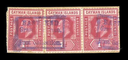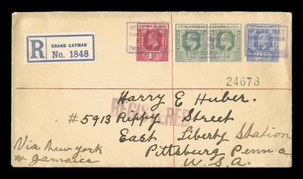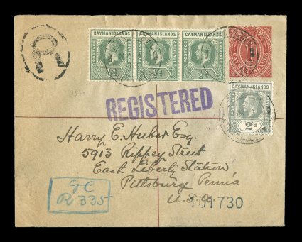 2365 c image1p Red postal envelope, with 1/2p Green strip of three and 2p Pale grey (S.G. #41, 43), registered to the United States with the stamps tied by "Georgetown/Grand Cayman/MR 1 13" c.d.s., Type 5 pmk., scarce "GC" blue crayon registry etiquette with numbers below, Type R4, Kingston and Philadelphia registry transits, backstamped Pittsburgh, slight aging to envelope and small mounting flaws on the reverse, very fine; scarce registered usage with this abbreviated registry marking (Scott #33, 35). (Image) Est. 300-400