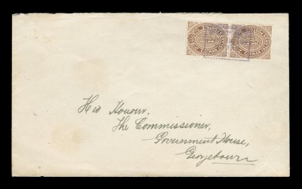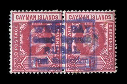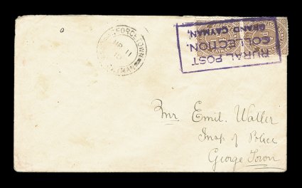2367 c image"Rural Post/Collection/Grand Cayman" violet boxed handstamp, Type RP1, an exceptionally strong clear strike of this rare marking tying a 1908 1/4p Brown vertical pair (S.G. #38) to commercial domestic cover to Georgetown, addressed to Mr. Emil. Walter, Inspector of Police, "Georgetown/Grand Cayman/MR 11 10" c.d.s. receiving pmk., Type 5, cover with slight edge wear and stamps affixed slightly over the edge nibbing a few perfs., very fine; this is the first type of rural collection marking used on the route from Boddentown to Georgetown, in itself it is a rare marking with only 31 covers recorded, but this cover is especially desirable being a commercial usage, plus being the earliest recorded usage on the one farthing value, which was issued especially for this rural domestic service, requiring two in this case to pay the new 1/2p domestic letter rate; ex-Cooley (Scot #31). (Image) Est. 1,500-2,000