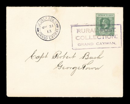 2368 c image"Rural Post/Collection/Grand Cayman" violet boxed handstamp, Type RP1, handsome complete strike tying 1912 1/2p Green (S.G. #41) to neat domestic cover to Georgetown, "Georgetown/Grand Cayman/MY 31 13" c.d.s. receiving pmk., Type 5, minor cover scuff at top of cover, not affecting stamp or markings, actually exceptionally clean and attractive, very fine; it is believed this canceller was lost during a hurricane in 1917, but the latest recorded usage is this May 31, 1913 date (Scott #33). (Image) Est. 1,000-1,500