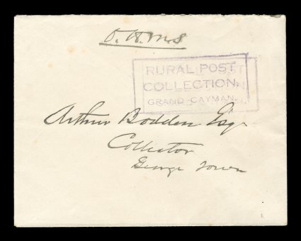 2369 c image"Rural Post/Collection/Grand Cayman" violet boxed handstamp, Type RP1, a most unusual official cover endorsed "O.H.M.S.", without franking as was proper for a domestic usage (the usually seen franked O.H.M.S. covers had stamps because they were foreign mail), posted to Georgetown with a doubling of the marking, one being clear and readable, not having a receiving postmark so undated, mounting thins on the reverse, otherwise very fine; a very rare official posting along this rural route from Boddentown to Georgetown; ex-"Rew", Green. (Image) Est. 1,500-2,000