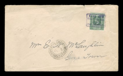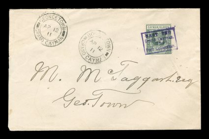 2370 c image"East End/Grand Cayman/Rural/Post Gollection" boxed violet handstamp, Type RP2, a sharp early strike tying a 1907 1/2p Green (S.G. #25) to early 1911 cover to Georgetown, "Boddentown/Grand Cayman/AP 12 11" c.d.s. transit at left, Type 2, and similar Type 5 Georgetown receiving pmk. of the same date, addressed to M. McTaggart, Esq. in Georgetown, slight wrinkles to cover and reduced a bit at left, markings are clear and attractive, very fine; this rare marking was placed on covers by the "Wagoner" for mail that was collected between East End and Boddentown, only about 40 covers are recorded with this marking; it is not known how early the marking was placed in use but this is one of the earliest dates (only March 8, 1911 being earlier) and this pre-dates the earliest date of January 17, 1912 for this value listed by Giraldi and McCann; a lovely and very rare commercial cover of this domestic 1/2p domestic rate; ex-Green (Scott #21). (Image) Est. 1,500-2,000