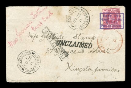 2372 c image"East End/Grand Cayman/Rural/Post Gollection" boxed violet handstamp, Type RP2, a perfect early strike tying a 1907 1p Carmine (S.G. #26) to cover to Kingston, Jamaica with both Boddentown and Georgetown double circle c.d.s. of October 25, 1911, Types 2 and 5 postmarks respectively, with slightly smudged strike of boxed "Advertised" handstamp and choice strike of "Unclaimed" handstamp on the front, manuscript ""Not Known" on the reverse with numerous transits and backstamps on the reverse for its return, red crayon "Miss. Jessica Laturn/East End" at top left, probably put on by the postman who would have known who originally sent it, light cover creases, otherwise very fine; an extremely rare and one of the most interesting and unusual foreign mail usages of this marking paying the 1p Empire letter rate, it pre-dates the October 16, 1912 date listed for this value by Giraldi and McCann, but this maybe should be 1911 since that work illustrates this cover; 1992 RPS certificate; ex-Rohloff, Marston and Prappas (Scott #22). (Image) Est. 2,000-3,000