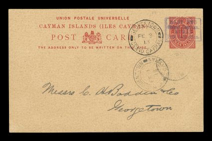 2373 c image"East End/Grand Cayman/Rural/Post Gollection" boxed violet handstamp, Type RP2, nice strike on 1909 1p Carmine postal card to Georgetown, "Boddentown/Grand Cayman/FE 1 13" c.d.s. transit below, Type 2, and a similar Type 5 Georgetown receiving c.d.s. at left of February 3rd, couple of trivial card bends, but overall a crisp and very fine postal card; overpaid as the domestic postal card/printed matter rate at this time was only 1/4p, but message on the reverse reveals that this is actually a legitimate commercial usage as the correspondent is ordering a pair of men's boots, size 8, from the merchant C. H. Bodden & Co. in Georgetown, extremely rare as there are only two or three examples of this card used from East End on the rural route. (Image) Est. 1,000-1,500