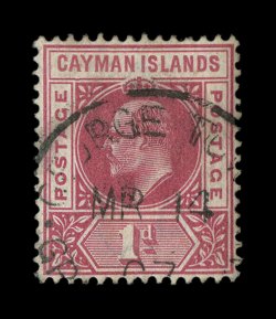 2083 O S.G. #4a imageS.G. #4a, 1903 1p Carmine, dented frame variety, position L 1/6, a scarcer used example with large portion of George Town c.d.s., Type 4, dated March 14, 1907, well centered, very fine (Scott #4 var.). (Image) £225