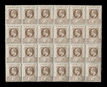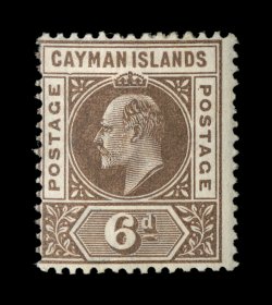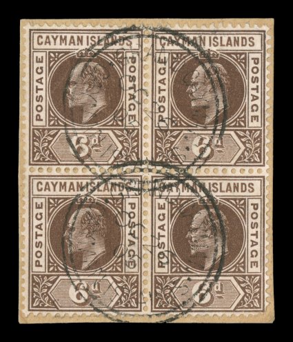 2095 Obl S.G. #11 imageS.G. #11, 1905 6p Brown, exceptionally scarce used block of four, tied to piece by two strikes of Grand Cayman/Cayman Islands/OC 26 05" double circle c.d.s., Type 3a pmk. of Georgetown, well centered and very fine; used have always been scarcer than mint, but a used block is even scarcer yet (Scott #11). (Image) Est. 200-300