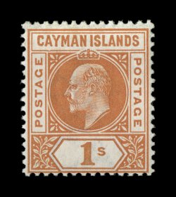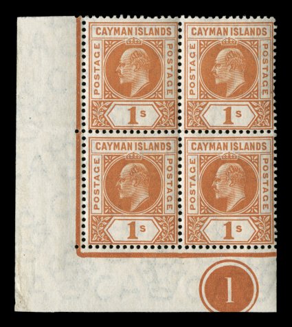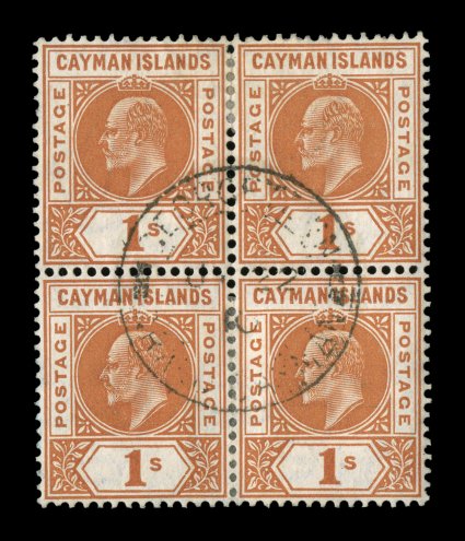 2097 Obl S.G. #12 imageS.G. #12, 1905 1/- Orange, well centered block of four with central "Georgetown/Grand Cayman/JY 22 10" c.d.s., Type 5 pmk. of Georgetown, fresh with bright color, minor hinge reinforcement, very fine; remnant of a blue crayon line picked up from the original cover indicates that it was on a registered sending, a rare used block of this high value (Scott #12). (Image) Est. 300-400