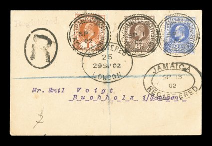 2087 c S.G. #5, 6a. 7a imageS.G. #5, 6a, 7a, 1902 2 1/2p Bright Blue, 6p Brown and 1/- Orange, the last two with the dented frame variety, registered cover to Germany franked with the three additional higher values, posted just a couple of weeks before the new King Edward VII 1/2p was issued, all three tied by excellent strikes of "Grand Cayman/Cayman Islands/SP 1 02" double circle c.d.s., Type 3a pmk. of Georgetown, Jamaica oval registry handstamp and backstamped Bucholtz, choice very fine; this was made as a philatelic "set" cover but of greatest significance is the two values possessing the rare Glover flaw of the dented frame, both are very scarce as mint stamps and even rarer as used with the 6p not priced thus and the 1/- Orange valued at £850, their rarity on cover is raised to new heights with this being the only known Cayman Islands cover with two dented frame varieties on the same cover (Scott #5, 6 var., 7 var.). (Image) Est. 2,000-3,000
