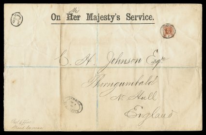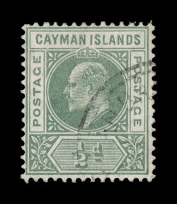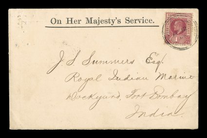 2088 c S.G. #4 imageS.G. #4, 1903 1p Carmine, well centered single tied to "On Her Majesty's Service" cover of the previous reign by "Grand Cayman/Cayman Islands/AP 12 04" double circle c.d.s., Type 3a cancel of Georgetown, posted to the Dockyard of Port Bombay, India, on the reverse are Kingston, Jamaica and Sea Post Office transits, small indentations to the top left corner of the cover, very fine and an unusually scarce destination (Scott #4). (Image) Est. 300-400