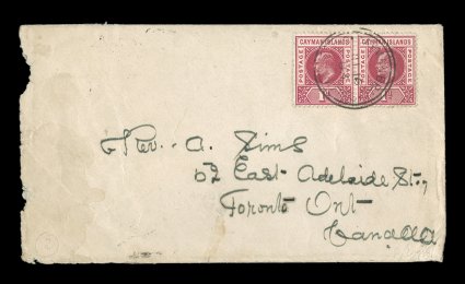 2089 c S.G. #4 imageS.G. #4, 1903 1p Carmine, horizontal pair tied to cover to Canada by "Cayman Brac/Cayman Islands/JU 16 03" c.d.s., Type 2, via Kingston and New York with transit c.d.s., backstamped Toronto, cover opened roughly at left with portion of left backflap missing, not affecting the stamps, fine and rare cover; not only is this a scarcer destination but this is a very early usage from this small post office as this value was not issued until March, 1903 (Scott #4). (Image) Est. 400-500
